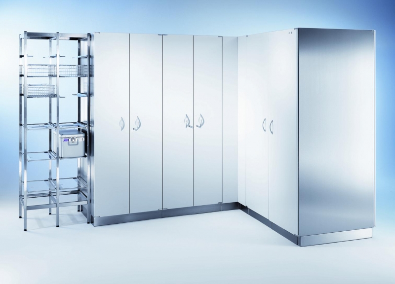 pro uzavřené uskladnění sterilního vybavení v Shuttle zasouvacích stojanech, dvoustěnná sendvičová konstrukce, s křídlovými dvířky, dvířka zavěšená na pravé nebo levé straně, s dvoustěnným dnem, s profilem k navedení a blokování zasouvacího stojanu ke skříni, se zabudovaným čelním naváděcím systémem, CNS 18/10 2 křídlová dvířka, 2 úchytky pro zasouvací stojan 1 x 9 STJ, 1150 x 757 x 2100 mm |